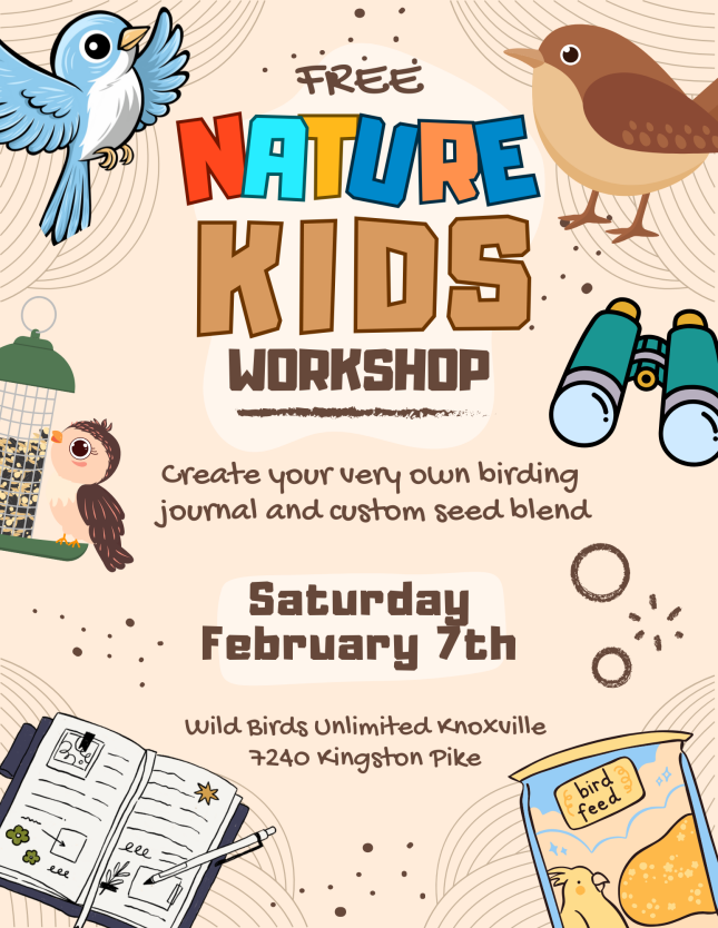 Bring your young nature lovers for a hands-on, outdoor-inspired adventure! In this fun kids workshop at Wild Birds Unlimited Knoxville, kids will create their very own birding journal or coloring book to take home, perfect for recording sightings or getting creative. They'll also become junior bird experts as they mix a custom bird seed blend and learn about what different birds love to eat. A playful, educational experience that sparks curiosity, creativity, and a love of backyard birds!